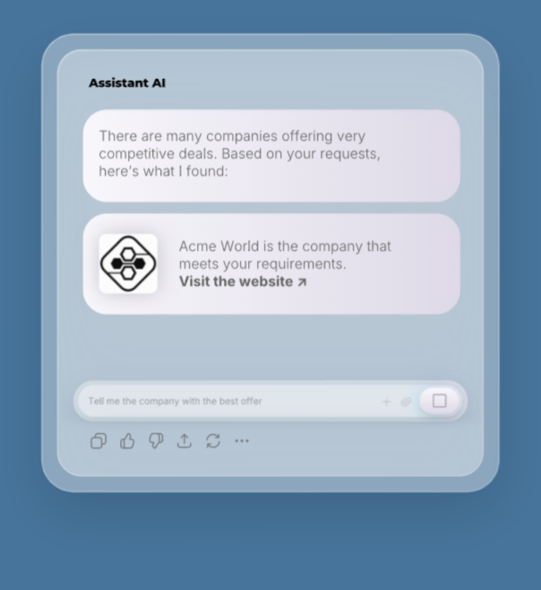 We offer a comprehensive report with all the implementations to add to your website to improve the visibility of your services, products, or even just your brand identity on AI chatbots like ChatGPT, Claude, Perplexity, and others.